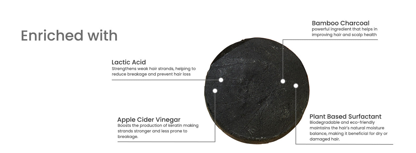 Moisturisation With Shine : The Bamboo & Charcoal Shampoo Bar is a natural solid bar that cleans hair while preserving natural protective oils. It doesn't wash away them and protects the scalp for its betterment as it contains Aloe Vera and Coconut Oil. These natural fundamentals soothe the scalp while moisturizing hair. It brings luster and shine to every strand. Aloe vera has super healing and soothing power and coconut oil is known for its dynamic quality when it comes to deep conditioning. Both the ingredients aid in enhancing your hair and scalp health. This innovative shampoo bar moisturizes and nourishes your hair, so it feels revived and healthy with a natural shine.