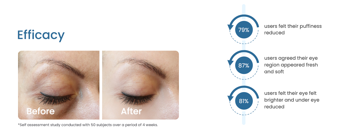 - Hyaluronic Acid - Hyaluronic acid is a natural humectant which provides an intense amount of hydration to the skin. Hence, by applying this compound under the eyes, it imparts moisture, soothes the skin tissue and reduces the appearance of fine lines around the eyes.