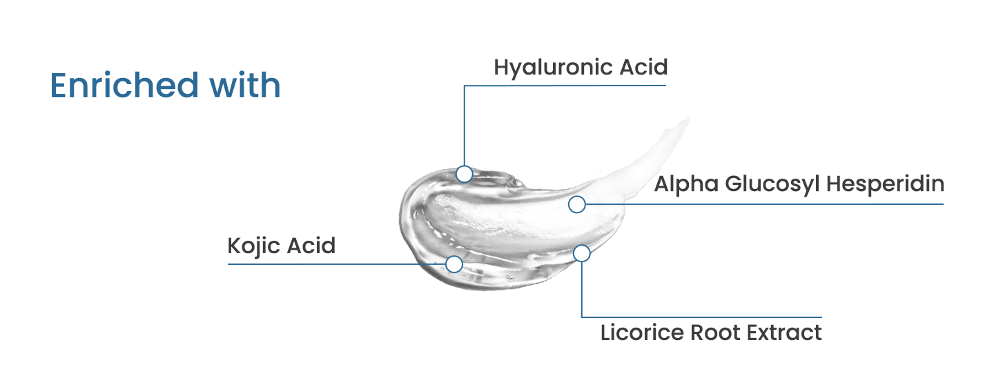 - Kojic Acid - Kojic acid is a powerful ingredient that restricts the occurrence of tyrosinase enzyme, which increases melanin production in the skin. By doing this, this compound helps in fading dark spots giving bright under eyes. Kojic acid has gained popularity as a skin-brightening agent for providing even tone skin, reducing the appearance of dark circles under the eyes.