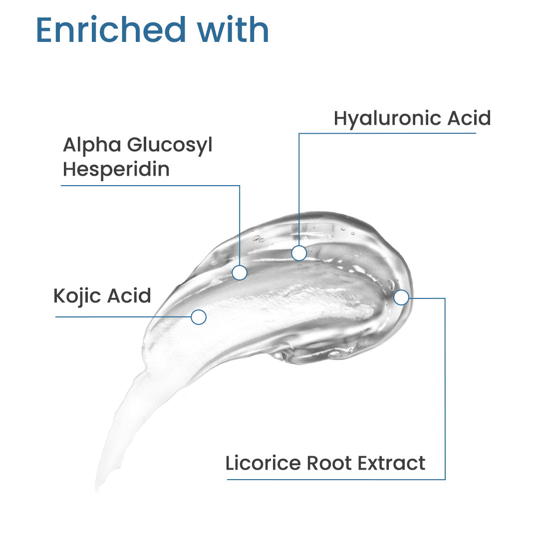 Ingredients: Aqua, Glycerin, Propanediol, Kojic Acid, Sodium Hyaluronate, Glycyrrhiza Glabra (Licorice) Root Extract, Glucosyl Hesperidin, Glycerin (and) Aqua (and) Cucumis Sativus (Cucumber) Fruit Extract, Coffea Arabica (Coffee) Seed Extract, Aqua (and) Aloe Barbadensis Leaf Extract, Phenoxyethanol, trimethylene glycol.
