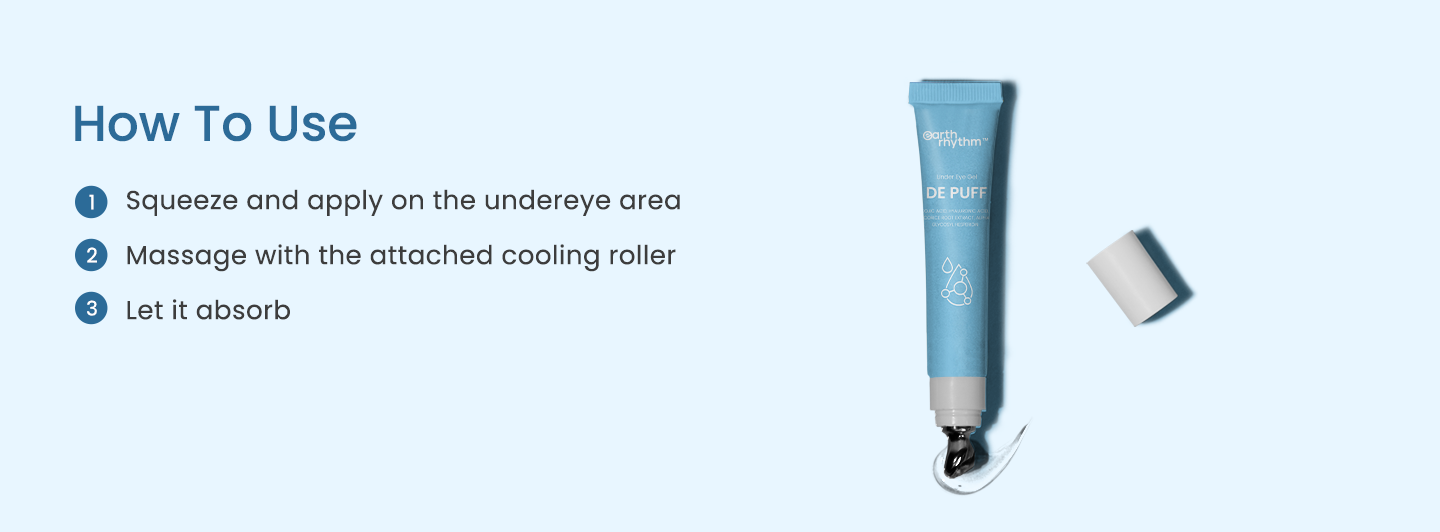 The Earth Rhythm’s Depuff-Under Eye Gel works astoundingly well when applied in a systematic way to experience its efficacy. Here is the complete step-wise guide to using the Depuff-Under Eye gel for its best application: