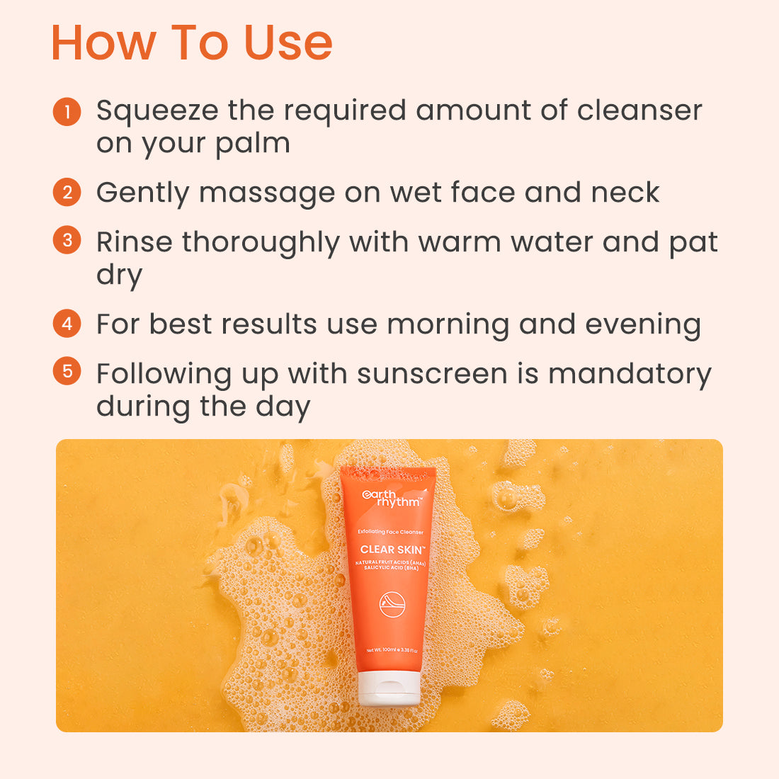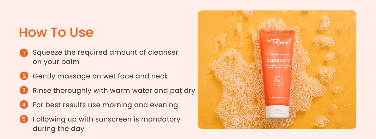 To use Face Wash with AHA-BHA and salicylic acid cleanser, wet your face with warm water and apply a small amount of the product to your fingertips. Massage the cleanser onto your skin in circular motions, focusing on areas that are prone to congestion, such as the T-zone. Rinse thoroughly with warm water and pat your skin dry.