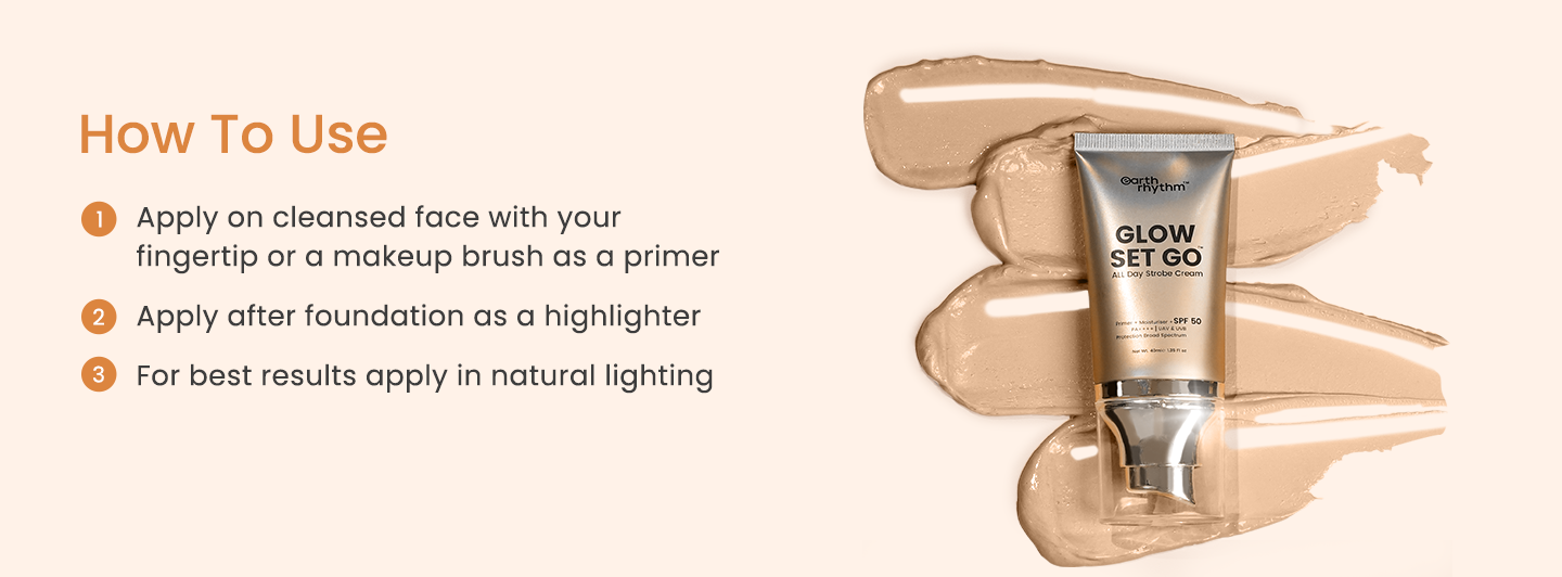 A versatile luminous cream can be used as a primer, i.e., before the application of foundation. Clean your face with a cleanser and prepare the skin with serum or moisturizer. Then, take the Glow Set Go Strobe Cream in a few dots and evenly spread the same with your fingertips or makeup blending brush.