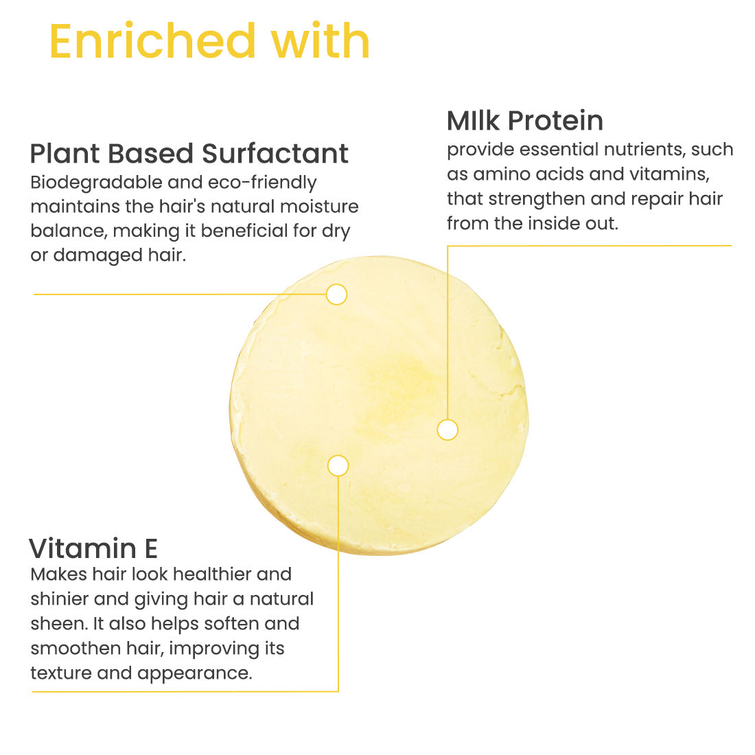 Protein is essential for hair growth. It's a solid shampoo bar enriched with milk proteins. It aids in strengthening the hair roots while cleansing away impurities from the scalp. A healthy scalp heightens the hair rejuvenating process, so by choosing this shampoo bar it helps to strengthen your roots and revive your hair. Unlike your regular liquid shampoo, this solid shampoo bar has no harmful ingredients or fragrance, so your hair doesn't undergo any hindrances. The milk protein fortifies the hair roots in a natural way.