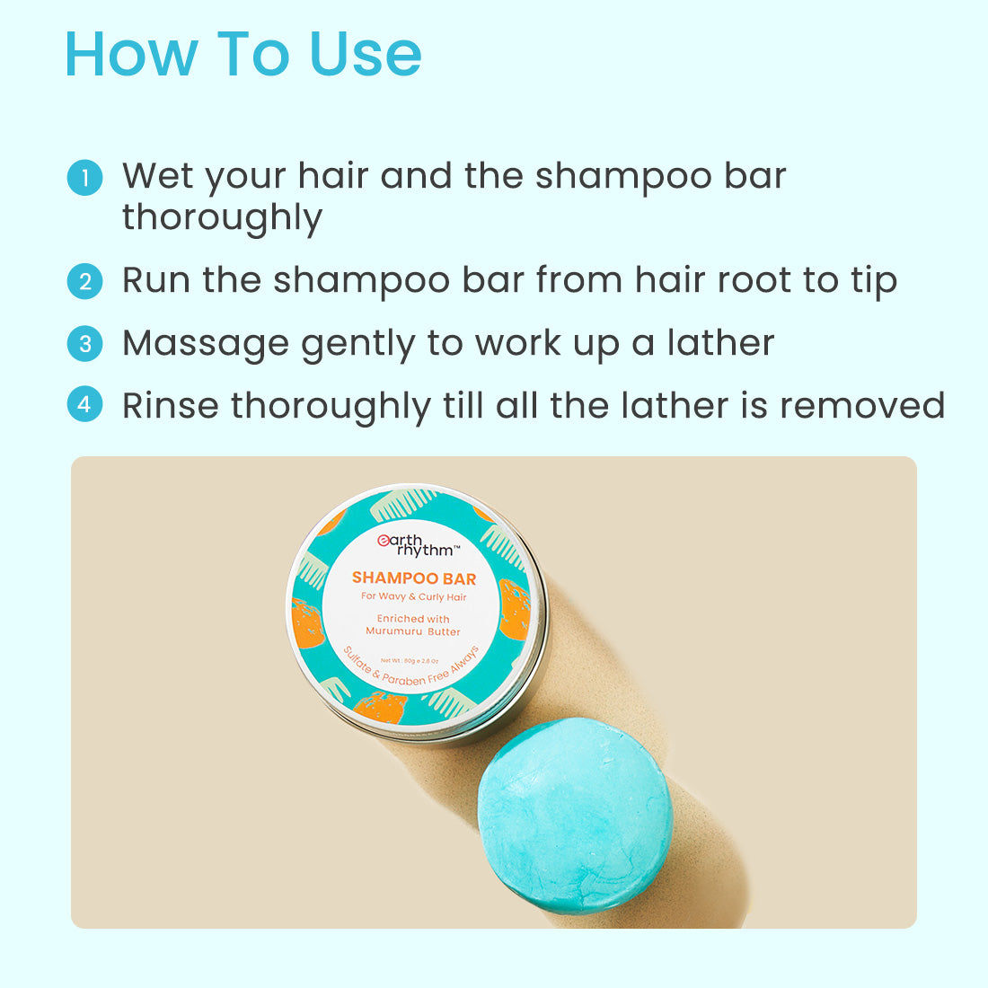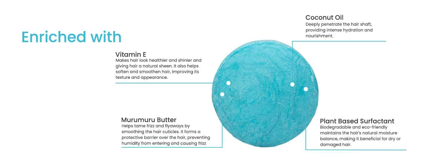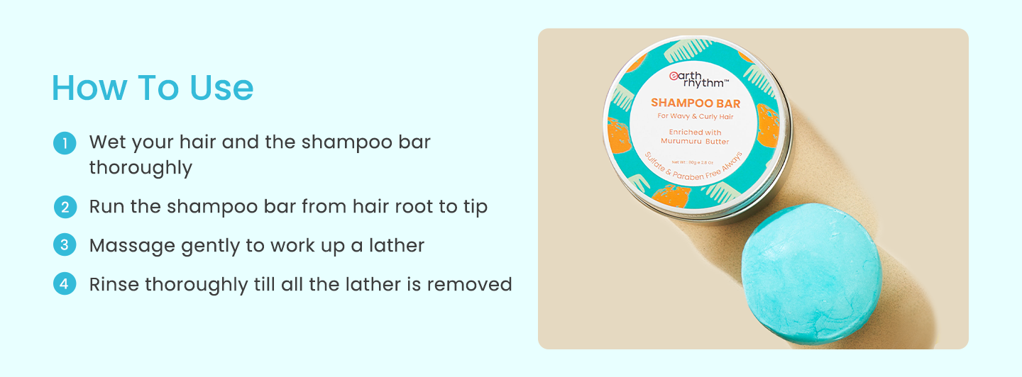 The best way to use Murumuru butter shampoo bar, a mild shampoo best for dry and curly hair, is to wet your hair nicely with warm water. Then, gently moisten the bar and massage it straight through your hair right from your scalp towards the ends. Next, massage it using the pads of your fingers, working up a thick lather. It is advised to not use your fingernails. Post thorough lathering and massage, rinse nicely with warm water until all of the shampoo lather is removed. The shampoo has a high affinity with the hair fibre, repairing damaged strands and recovering hair’s natural elasticity. It also creates a nourishing, protective layer over your hair that helps control frizz while restoring the lost sheen and softness to keep even the most unruly, dry and curly hair shiny and manageable.