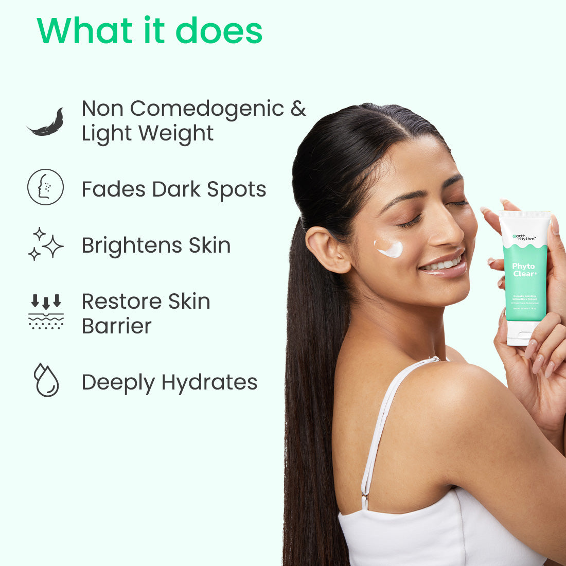 Earth Rhythm's Phyto Clear Oil-Free Moisturizer is the best moisturizer due to its fine and light feel. It's a lightweight cream for your daily face care. It doesn't give you that heavy feeling of oily face creams. The hassle-free moisturizer is perfect for daily usage due to its oil-free property and smooth texture. The moisturizer for face care is fragrance-free and has no artificial scent added to it, so it's pure.