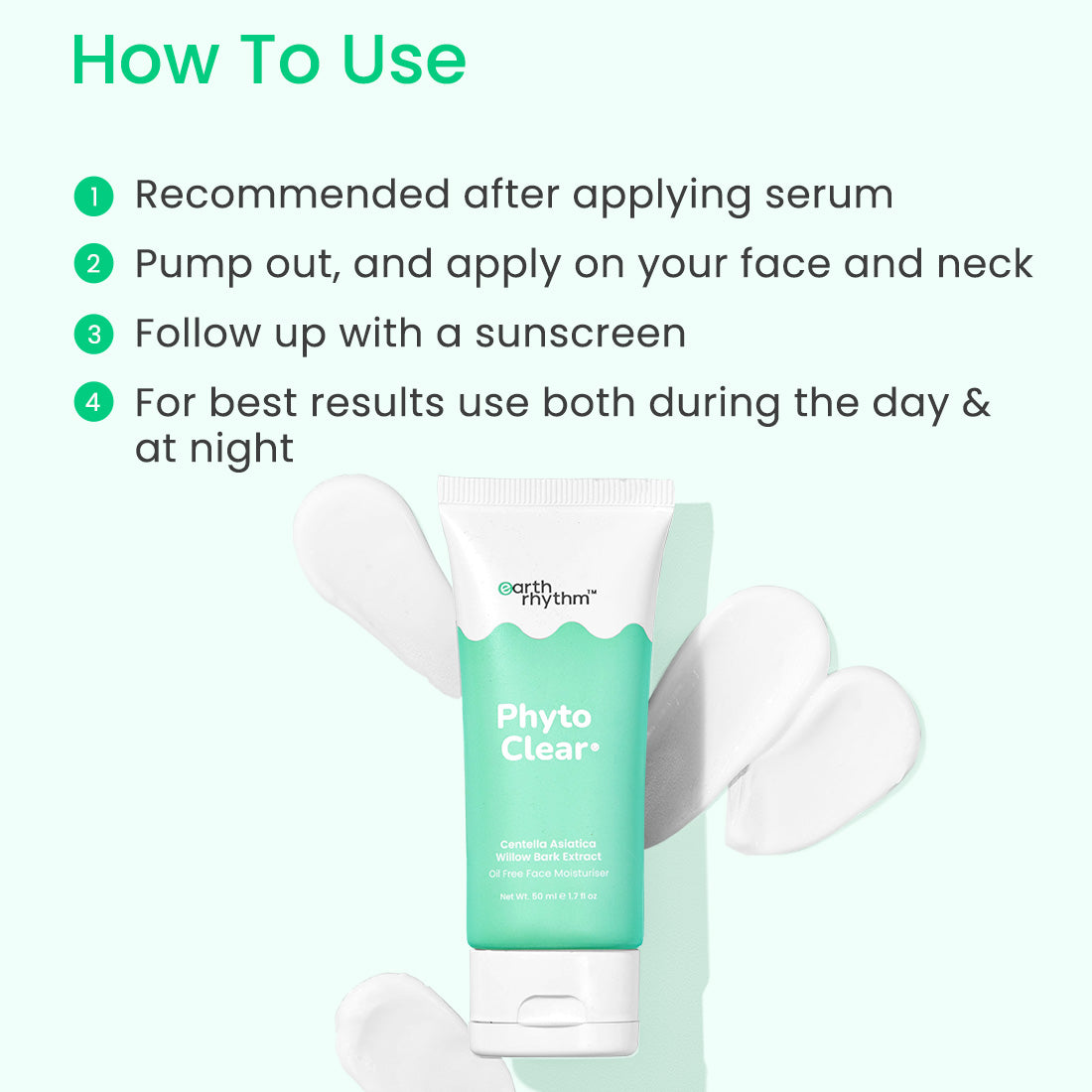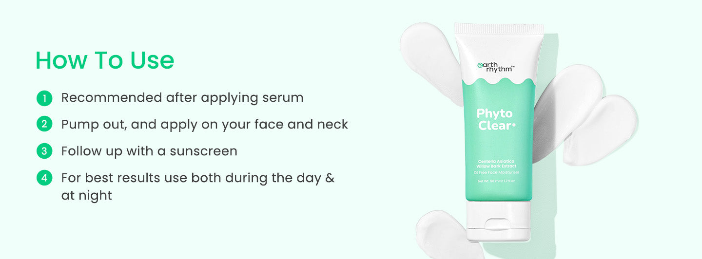 - Clean your face, pat it dry and take one to two pumps of Earth Rhythm's Phyto Clear Oil-Free Moisturizer on your clean palm.